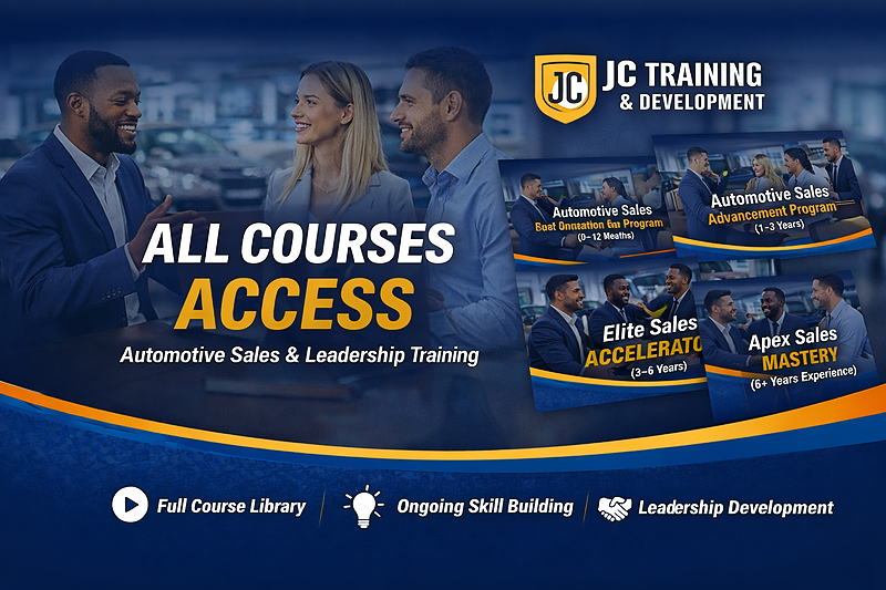 Bundle • 26 learning productsGet full access to the ultimate dealership training! Master sales, BDC, internet leads, phone skills, follow-up, and manager development. Gain the tools, strategies, and confidence to excel in every role and drive success at your dealership.